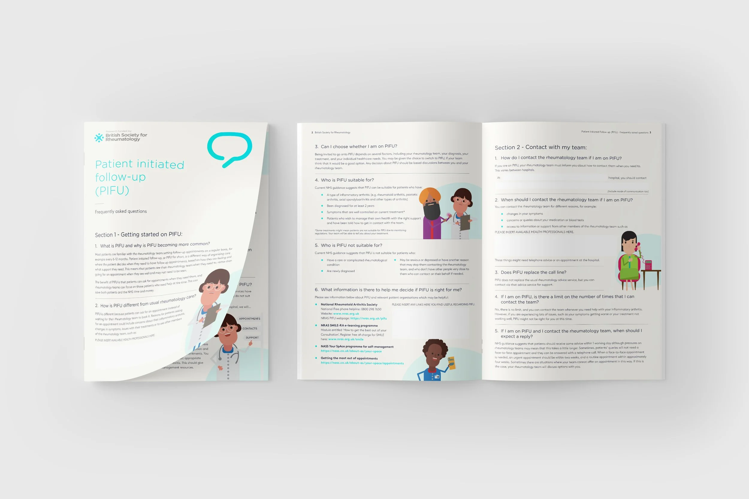 Brief: To create a “toolkit” that hospitals can use to help them implement PIFU. PIFU is a new way of providing outpatient care for patients with inflammatory arthritis instead of having booked standard appointments every 3-12 months, patients get distant appointments as they need. Toolkit consisted of a 3 minute animation, various language versions of this for accessibility, A clinicians handbook, and an FAQ’s doc.